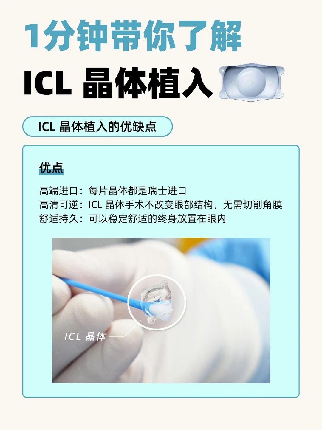 ICL晶体植入是将一枚定制的晶体(厚度仅50μm,比头发丝还薄)植入眼内虹膜后方,相当于在眼睛里放一副“隐形眼镜”。 它不切削角膜组织,保留眼球完整结构,术后可逆性强,未来视力变化还能取出或更换晶体。