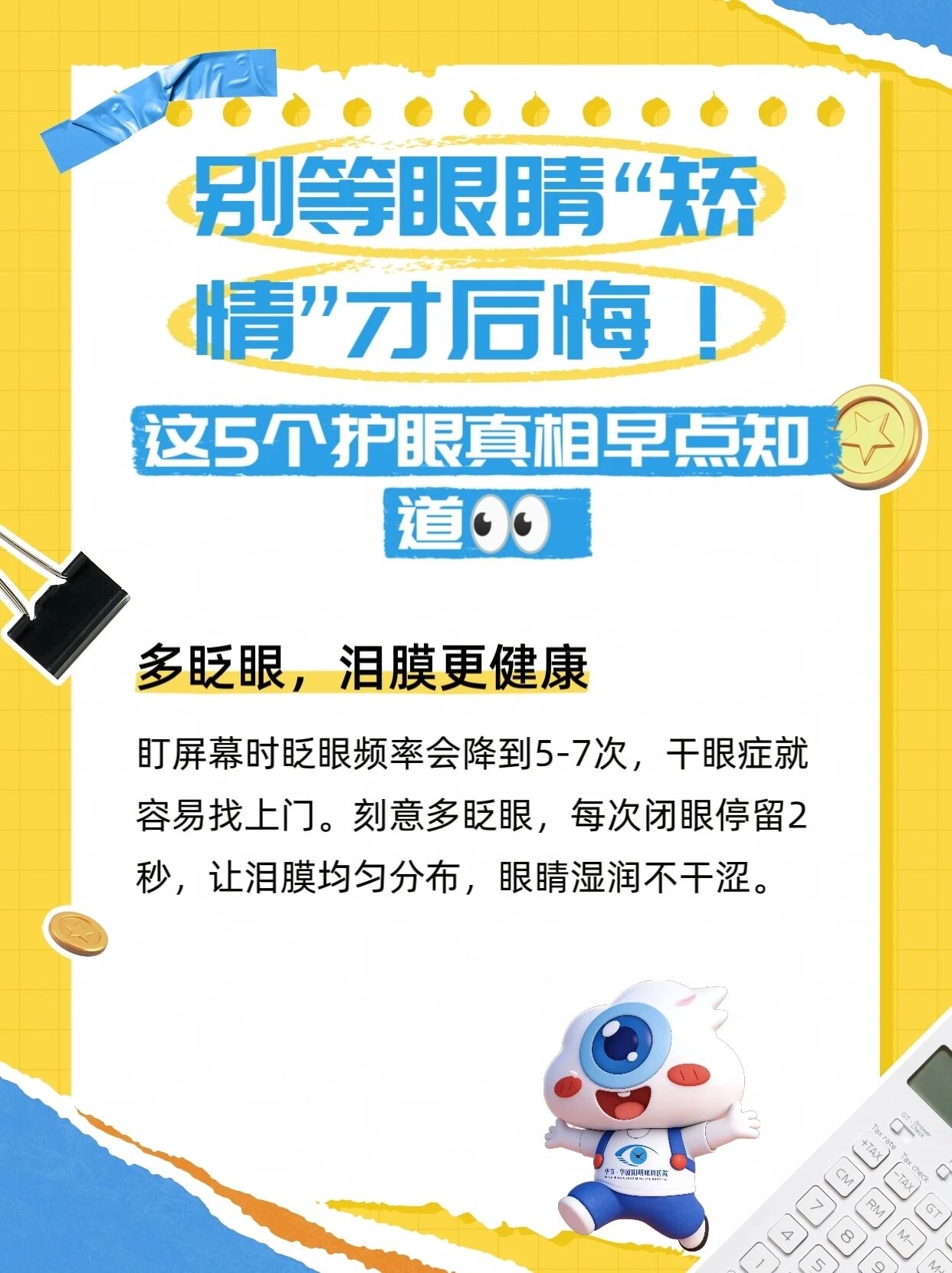 专注屏幕时眨眼频率从每分钟15-20次降到5-7次,泪膜破裂,干眼找上门。刻意眨眼,每次闭眼2秒。