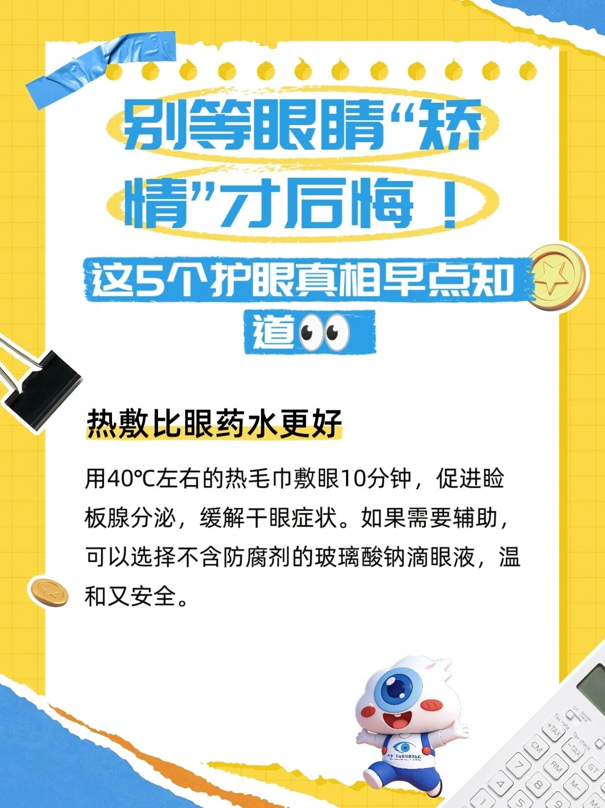 40℃左右热毛巾或蒸汽眼罩敷10分钟,促进睑板腺分泌,改善干眼。不含防腐剂的玻璃酸钠滴眼液可辅助。
